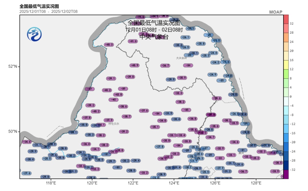大、小兴安岭多地遭遇极寒天气,气温降至-30摄氏度。内蒙古自治区安河图里河温度达到-38.7℃(新近(创国家气象台今年下半年最低气温纪录),宣江降至-38.6摄氏度,漠河达到-36.9摄氏度,冻成一团。