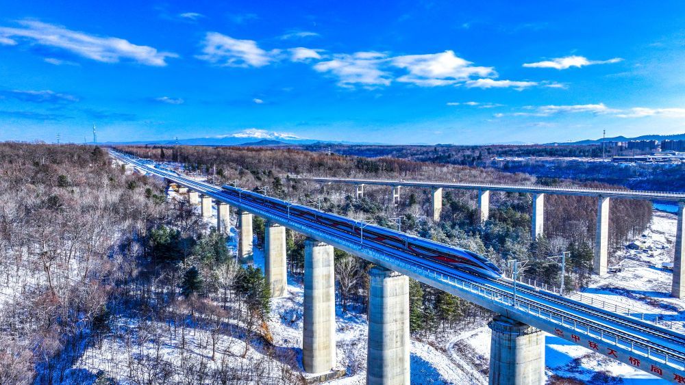 11月28日,复兴号列车穿过沉嘉高铁沉白段的森林和雪原。 (陈明提供)