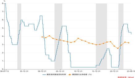 美国银行业的净利润率Y正在波动,但在大多数情况下,它保持相对较高的3%或更高水平。美国银行业不仅在利率上升的周期中保持了净息幅度很高,其中包括在2005年至2007年利率上升的周期中保持在3%以上的净利润率。但是,即使在降低利率的利息周期中,美国银行业行业也可以维持较高的利率扩散率与低价低于2.5%。